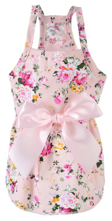 Tenké letní šatičky pro pejska na tenká ramínka s květovaným vzorem a mašlí na zádech. Oblékání přes hlavu.