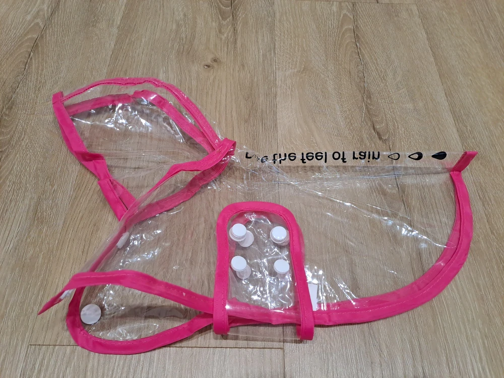 Lehká pláštěnka s kapucí, vhodná pro malá plemena, zapínání s patentky kolem hrudníku.