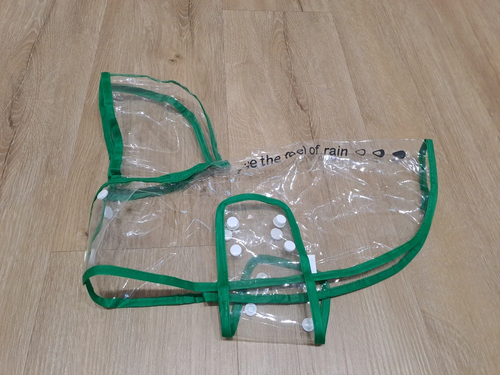 Lehká pláštěnka s kapucí, vhodná pro malá plemena, zapínání s patentky kolem hrudníku.