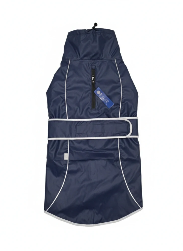 Kvalitní pláštěnka s vysokým límcem, která zajistí vysokou odolnost vůči silnému dešti. Zapínání na suchý zips kolem břicha na zádech a opatřena otvorem na vodítko.
